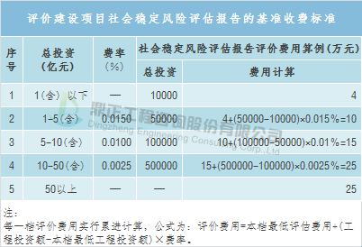 按照上述調整系數對建設項目社會穩定風險評估咨詢服務收費進行調整后,編制建設項目社會穩定風險評估報告的收費低于6萬元的,按6萬元計取,高于50萬元的按50萬元計取;評價建設項目社會穩定風險評估報告的收費低于4萬元的,按4萬元計取,高于25萬元的,按25萬元計取。