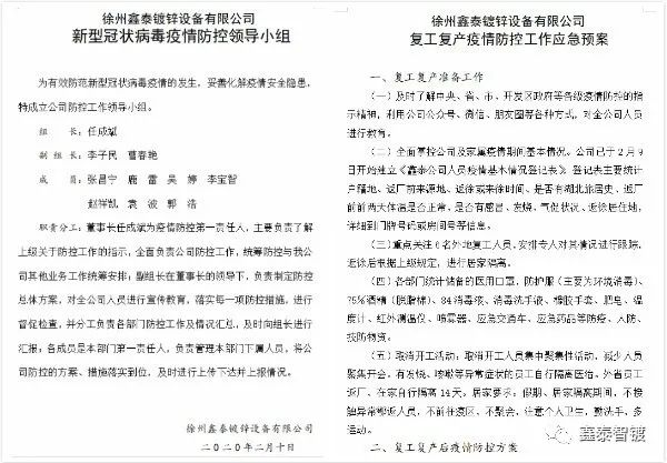 《徐州鑫泰鍍鋅設備有限公司復工復產疫情防控工作應急預案》。