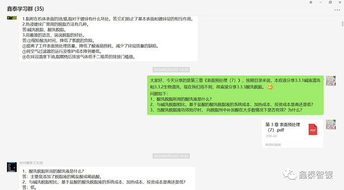 居家辦公期間不能忽視專業(yè)知識的學習。基于微信平臺建立學習群,由專人負責網上分享鍍鋅專業(yè)知識,并進行網上問答互動。